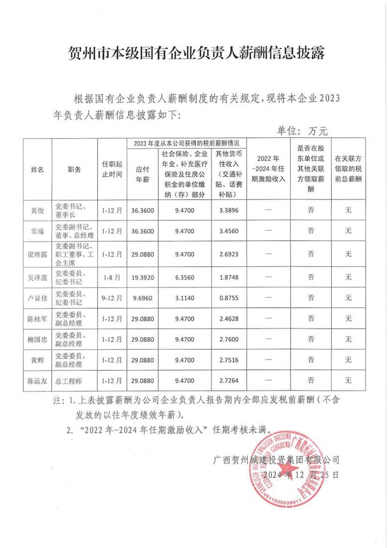 賀州市本級國有企業(yè)負(fù)責(zé)人薪酬信息披露2024-12-25